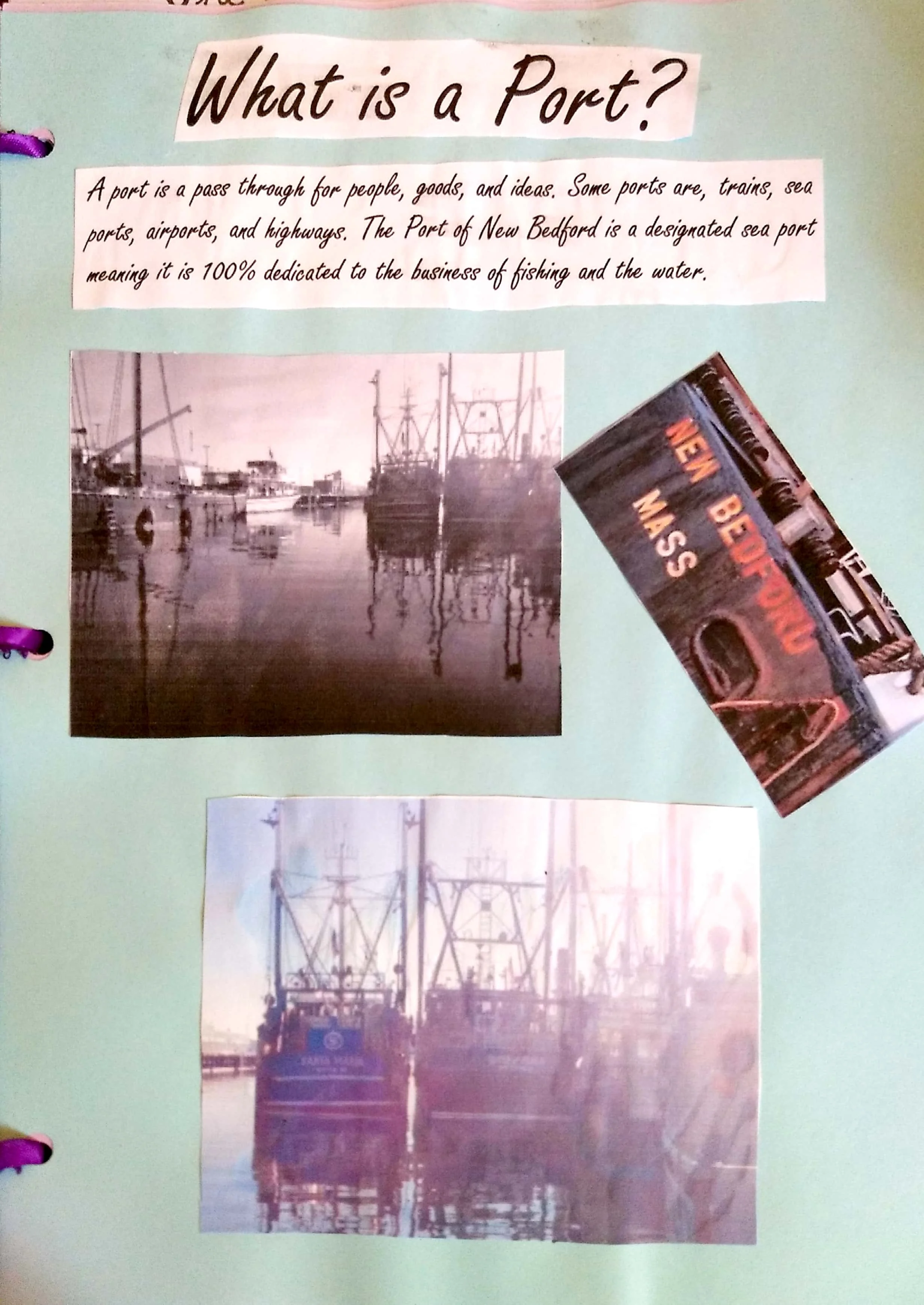 The journals of the past couple Port to Port classes have been sleek, black, and leatherbound, much like what most people picture when they think of the word journal. But in the earlier years of the class, they have much more closely resembled scrapbooks, made up of huge, threaded-together panels with ribbons and fabric woven through. Creating these journals was a simultaneously delightful and tedious experience; the trial and error of students, as well as their finished products, is depicted in the photos below.